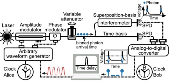DV-QKD System is available for testing. The prototype of the single photon source at 1550nm is ready in TRL5 in bulk and integrated form. It is a faint-pulse source that emits time-phase states in the decoy BB84 protocol. The clocks of the source and receiver are standard crystal oscillators with large clock frequency fluctuations in contrast to atomic references. They are synchronized by processing the arrival time information of a single photon according to the publication [1], resulting in only picosecond time deviations. The SPADs and SNSPDs with high efficiency are available for testing. * We can also offer the optimized design support for your hardware and prototyping and miniaturization/integration of your source. * Upgrade to HD-QKD is also available. [1] Christopher Spiess and Fabian Steinlechner, "Clock synchronization with pulsed single photon sources", Quantum Sci. Technol. 9, 015019 (2024). https://iopscience.iop.org/article/10.1088/2058-9565/ad0ce0/meta